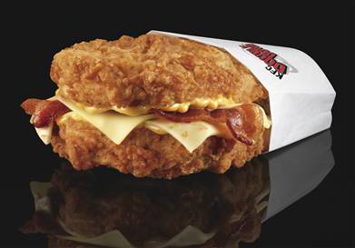 I don’t remember the last time I went to KFC, so there’s no real pattern shift for me here. I’m just wondering which executive made this up. I mean, the concept is what it is: “Let’s just throw whatever people like at them and see if we can get them to bite. People, generally, like fried chicken and bacon and treat bread as a necessary conveyance to their fried chicken and bacon loving end. ELIMINATE THAT MIDDLE MAN AND GET THAT DELICIOUSNESS IN ME.” Bingo bango.
